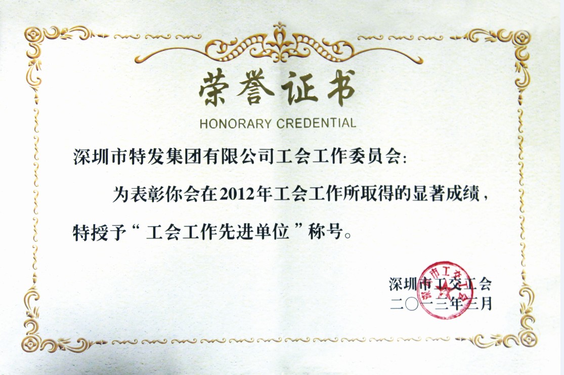2013年3月,集團(tuán)工委會(huì)獲深圳市工交工會(huì)授予2012年度“工會(huì)工作先進(jìn)單位”稱號(hào)。同時(shí),系統(tǒng)企業(yè)特力集團(tuán)紀(jì)昌建、特發(fā)物業(yè)公司姜海忠獲市工交工會(huì)“優(yōu)秀工會(huì)工作者”稱號(hào);特發(fā)信息李彬?qū)W、特發(fā)地產(chǎn)唐大平獲得市工交工會(huì)“優(yōu)秀職工之友”稱號(hào);集團(tuán)總部岳紅瓊、特發(fā)黎明牛慧寧獲市工交工會(huì)“優(yōu)秀工會(huì)積極分子”稱號(hào)。