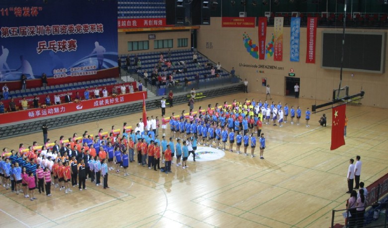 開幕式于10月29日上午8:30舉行。市國資委黨委書記柏立新,特發(fā)集團黨委書記、董事長劉愛群、黨委副書記、總經(jīng)理施長躍,國資委黨辦主任李明、副主任張曉中、唐明通,以及國資委系統(tǒng)企業(yè)的領(lǐng)導(dǎo)出席開幕式。開幕式由集團總經(jīng)理施長躍主持。此時的羅湖體育館一派歡快、濃烈的氛圍:主席臺正面高樹印有本次比賽徽標(biāo)和“2011‘特發(fā)杯’第五屆深圳市國資委黨委系統(tǒng)乒乓球賽”字樣的巨幅背景板,四周掛滿國資委和系統(tǒng)各企業(yè)的旗幟與祝比賽圓滿成功的條幅,以及“暢享運動魅力,成就美好生活”、“樹競技風(fēng)尚,展國企風(fēng)采”等標(biāo)語,各單位啦啦隊和觀眾坐滿看臺。伴隨著熱烈歡快的運動員進行曲,來自國資委系統(tǒng)21家單位的22支代表隊,在美麗端莊的引導(dǎo)員帶領(lǐng)下,隨著高舉國資委旗幟的旗手、護旗手依次入場,隊員們意氣風(fēng)發(fā),精神飽滿,步伐矯健,隊列整齊。在全體起立奏唱國歌、莊嚴(yán)的升國旗儀式后,集團董事長劉愛群和國資委黨委書記柏立新分別代表承辦方和組委會先后致辭。
